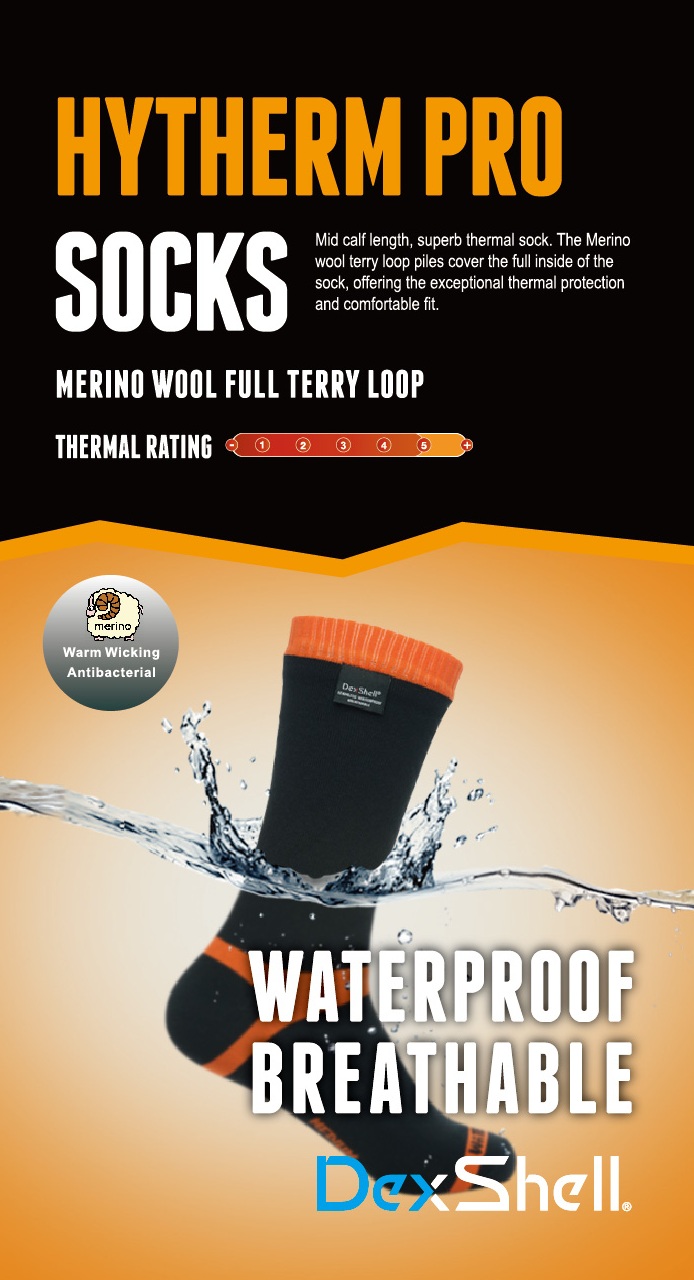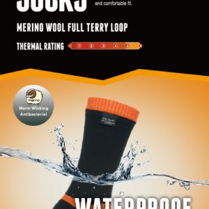 Merino nogavice znamke DEXSHELL so nepremočljive nogavice z visoko toplotno zaščito so vrhunske nogavice za zunanjo uporabo. Nogavice so mid calf (sredina spodnjega dela noge) dolžine. Te nogavice nudijo izjemno toplotno zaščito in udobje zaradi uporabe merino volne, kot notranjega sloja. Poleg toplotne zaščite, pa so tudi nepremočljive (waterproof) in pa odporne na veter (windproof), hkrati pa odlično dihajo.